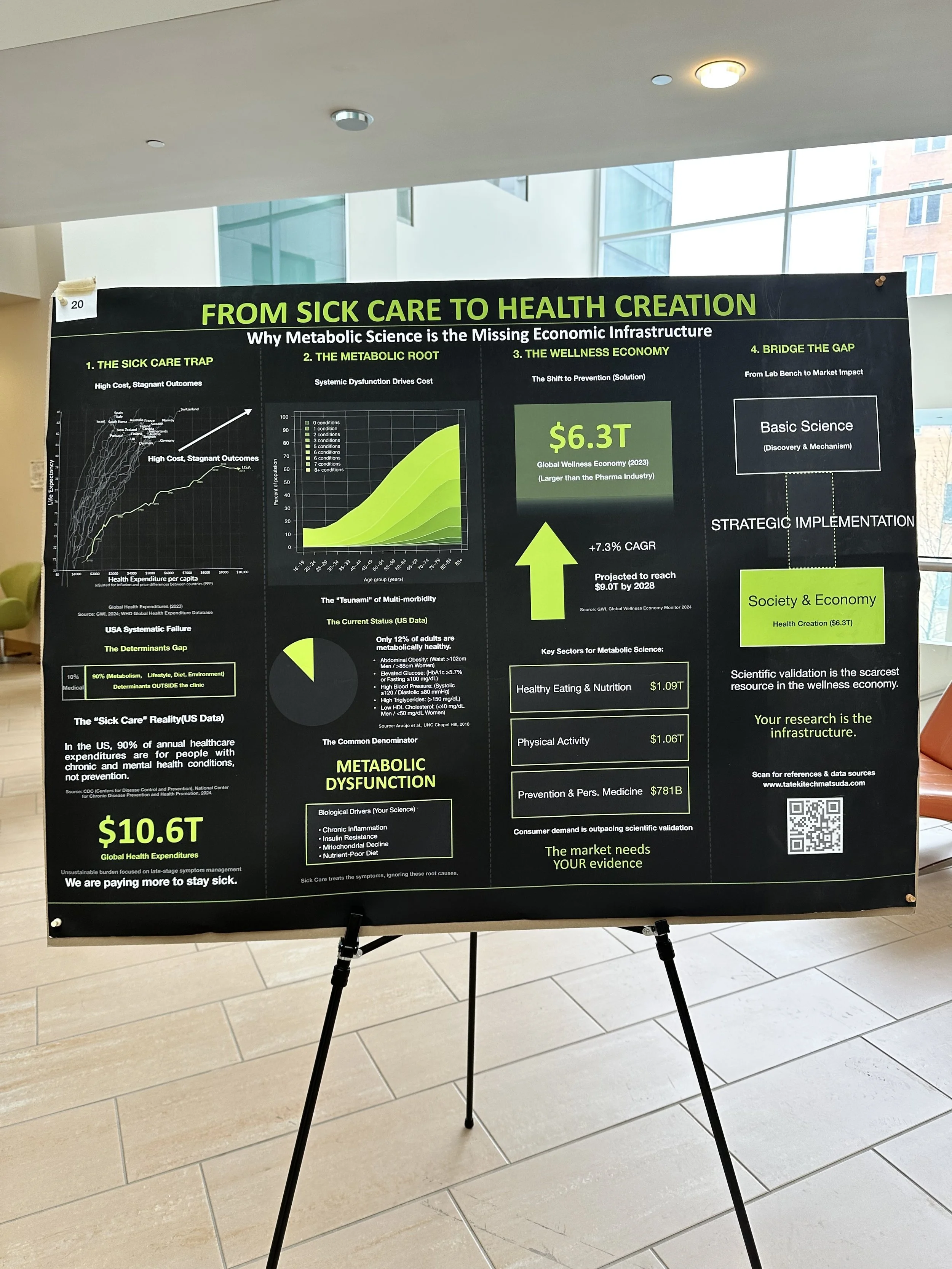 タテキのポスター左側に表示している「平均寿命対医療費支出(Lifespan Expectancy vs. Healthcare Expenditure)」の散布図が示すように、支出と健康成果の相関関係は崩壊しています。特に米国は最も極端な外れ値を示しています。一人当たりの支出が指数関数的に増加しているにもかかわらず、健康寿命の延伸は見られず、むしろ平均寿命は停滞、一部の層では低下さえしています。